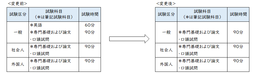 試験区分「一般」において英語筆記試験を廃止する(秋季・春季)。なお、 英語能力の審査については出願書類に英語外部試験スコアを含むことにより行う。